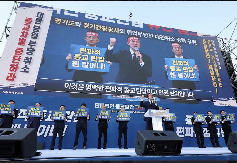 The rally followed the abrupt cancellation of New Heaven New Earth Church’s “Religious Leaders’ Forum and Graduation Ceremony” at Paju Imjingak Peace Nuri Park on October 29-just one day before the scheduled event. The Gyeonggi Tourism Organisation cited security concerns related to recent North Korean military activity as the reason for the decision, despite previously approving the venue on July 22.